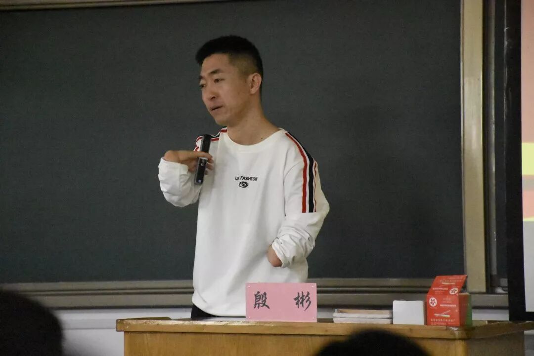 殷彬老师的双手,先天性的小臂及手部肌肉萎缩,然而他无比努力,收获了正常人都少有的成绩。但鲜艳的花,背后浸润无尽的血与泪。出生在农村的他,家境不优,而他的出生,也给这个家带来了不少困扰,村里的人都建议他的父母丢弃殷彬,但他的父母没有这样做,而是悉心养育他,在他厌恶自我时,一直鼓励、安慰他,做他强有力的后盾。 殷彬老师与同学们分享人生经历 起初,他没有现在这样乐观自信,心怀希望。他因畏惧他人的眼光,即使在炎热的夏日,他仍穿着长袖衣服。别人问他,不热吗?他只能小心掩饰,不热。实然,他热,自内而外的热,燃烧着,燃烧着他的渴望,燃烧着他的自尊。他何尝不想穿短袖、不想向别人一样凉爽。在一次又一次的自我斗争中,他饱受煎熬,似草奋力向上,寻觅自我。 因家境窘迫,在初一那年,殷彬便离开了校园。所以,他强烈地渴望着,走进大学的校门,学习自己喜爱的专业。要强的他毅然离开父母的庇佑,走向社会。他做过许多工作,受过不少委屈,尝尽不少心酸,他就是这样要强而坚韧。1998年,他阅报时看到北京“微晶雕刻”培训班的消息,他自幼喜爱画画,于是他内心的期冀被点燃。