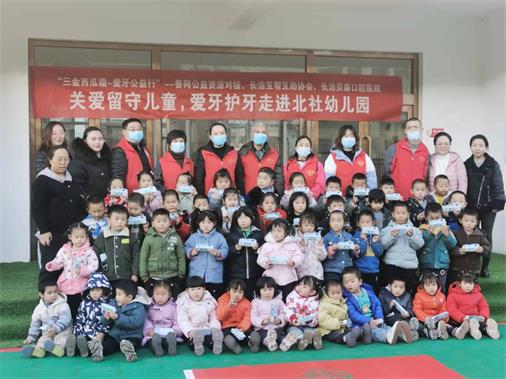 2021年11月12日下午,山西省长治市平顺县北社乡北社幼儿园迎来了穿红马甲的志愿者,他们是长治市互帮互助公益协会的志愿者,长治市贝森口腔医院的医护人员,由三金西瓜霜“爱牙公益行”——善网公益资源对接,志愿者给小朋友们讲了爱牙护牙的知识,赠送了爱牙护牙用品。还给孩子们购买了跳绳和铅笔。