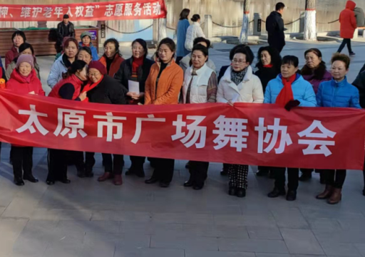 最后,太原市广场舞协会的老师自己编排出来的节目,给大家表演。志愿者们跟随《我和我的祖国》、《红、红、红》广场舞的节拍,用肢体语言诠释了生活在锦绣太原城的幸福感和安全感。