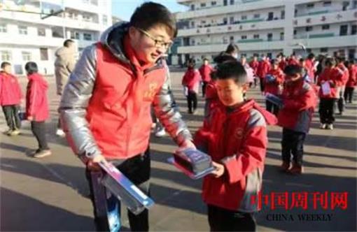 志愿者和孩子们在操场上做拔河游戏,孩子们为志愿者们戴上了鲜艳的红领巾,志愿者们将文具和体育包一一送到孩子们的手里。鼓励孩子们努力学习,增强体魄,茁壮成长。
