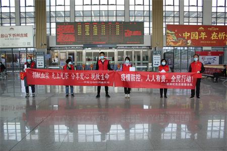 我红色志愿服务队志愿者和血浆站志愿者走近候车室,为忻州市忻府区新冠肺炎疫情防控办,发放通告,关于暂缓接收省外及省内的阳性病例报告所在地人员来(返)忻的通告,免费发放口罩,让旅客出行放心,安全到家。疫情防控,人人有责,全民行动 !做好个人防护,保护好,忻州交通最大高铁西站西大门。