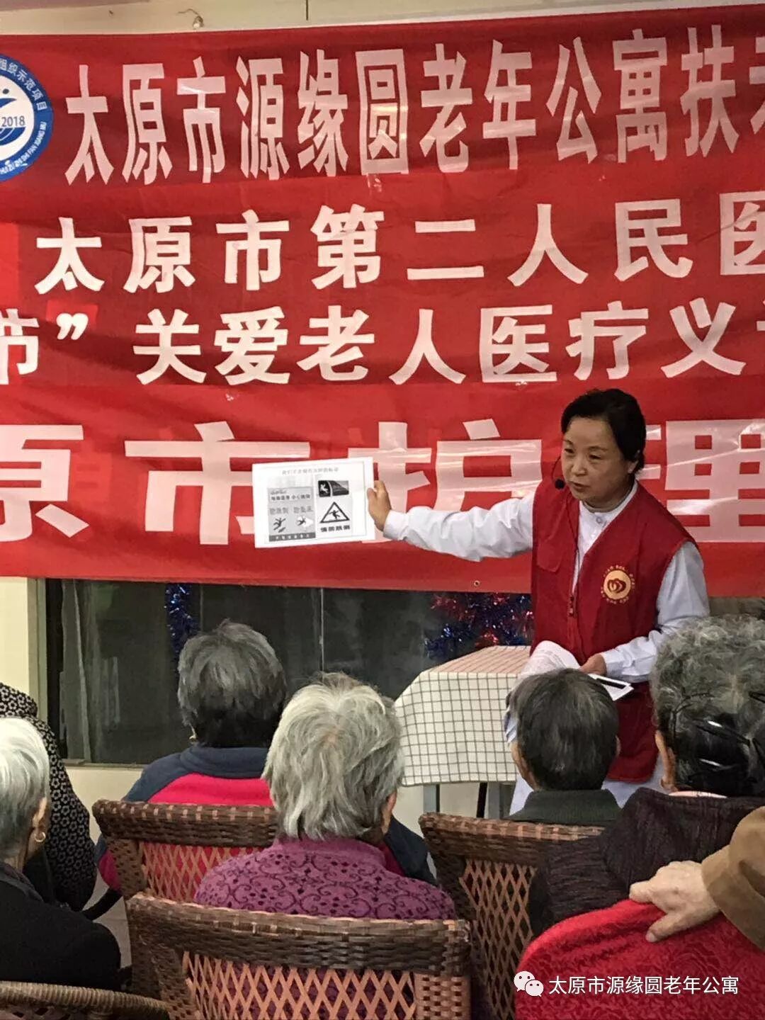 太原市护理学会郝立新老师正在为大家进行老年人该如何预防摔倒的知识讲解,为了让爷爷奶奶能更好的理解,专家特地绘制了容易理解的大图加文字,耐心的指着图片讲解。