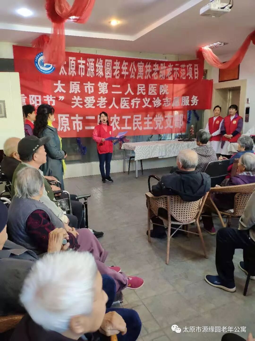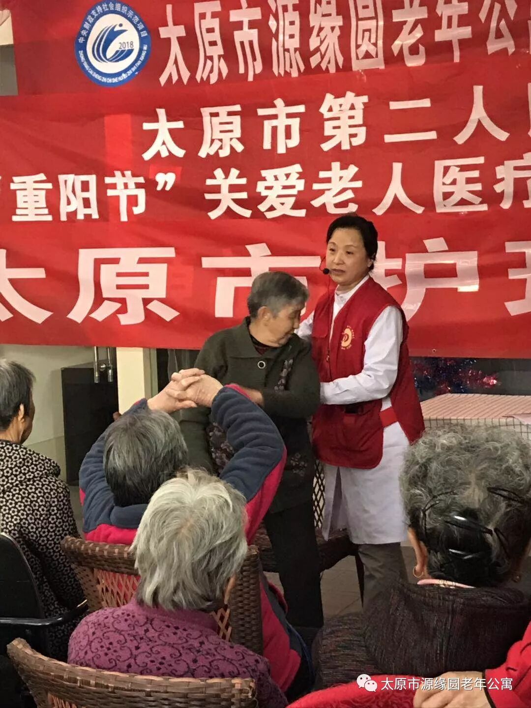 今日太原市第二人民医院宣传部帅慧荣、王雪,护理学会专家李春霞、郝立新 ,护理部薄凤萍、任海燕,老年病科大夫李卫东,呼吸内科大夫黄康,基层办秦建芳以及农工民主党支部人员来到我院,为爷爷奶奶举行重阳节健康讲座及巡诊活动。