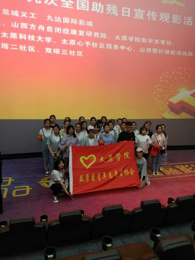 太原学院数学系志愿者在全国助残日服务残疾人士免费看电影。2019年5月18日上午,九达国际影城门口热闹非凡,人来人往,熙熙攘攘,志愿者们忙忙碌碌,小孩及家长赶着奔向影院,过路的人们纷纷问询,今天看电影的人为什么这么多,太原学院数学系志愿者赶忙给大家解释,太原市龙城义工志愿者团队联合九达国际影城免费为残疾人士,残疾儿童放映电影。