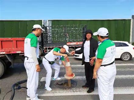 小店街办水上运动中心U站的志愿者守护烂井盖维护行人安全。勤勤恳恳做人,实实在在做事。
