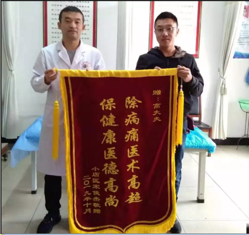 2019年10月16日,西温庄乡卫生院中医科再次上演了温馨一幕:患者宋俊杰手捧写有“除病痛医术高超,保健康医德高尚”的锦旗,送到中医科高海峰主任手中,表示对他治愈顽疾的感谢。