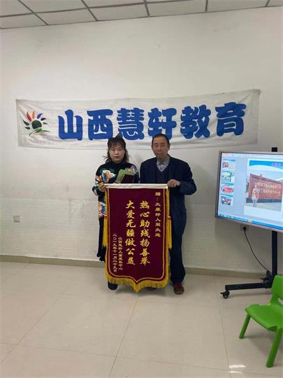 山西慧轩儿童成长中心给太原好人周太道颁发锦旗,感谢周太道对慧轩自闭症儿童的关怀。