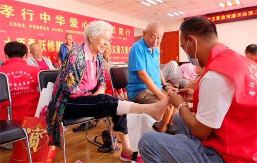 9月4日上午,获得中华慈善总会大力支持,由中商联沐浴委修脚分会主办,江苏宿迁市的“小李飞刀”承办的“孝行中华全国义剪万里行”第30次志愿服务走进太原,在小店区长治路二社区,志愿者们给社区的老人们义务修脚。