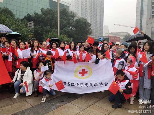 为热烈庆祝中华人民共和国成立71周年庆祝活动,山西省红十字志愿者协会、省城学雷锋志愿服务总团、太原市志愿者协会等志愿者和部分医务工作者冒着蒙蒙秋雨,在省城五一广场参加升旗仪式后,展开了唱红歌、颂祖国活动。