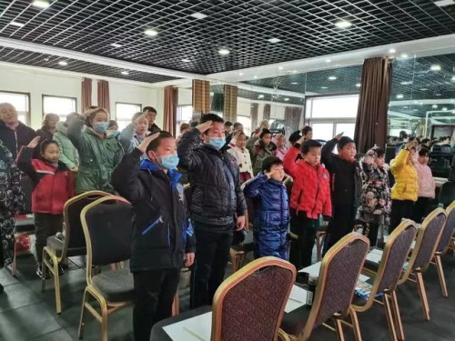 第三种关爱,受捐儿童在龙栖湖会议厅行队礼致谢!