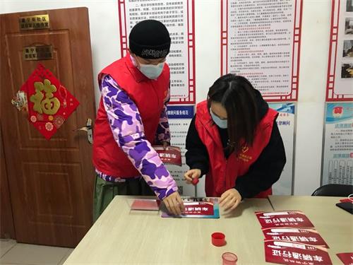1月15日下午,康宁街社区在两个卡口安置集装箱、封锁出入口后,自制社区人员通行证和车辆通行证,需要在上面盖上社区居委会的章,两位志愿者开始投入到工作中,年轻的他们好学上进,很快掌握了对登记、测温、消杀、盖章、分类等工作。