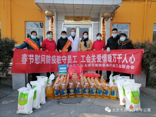 2月5日上午,太原市家政服务行业工会联合会王珍娥主席带领爱心志愿者,走进太原市源缘圆老年公寓慰问公寓春节期间驻守员工,还送来米、面、油、台历、对联及防控物资等慰问品。