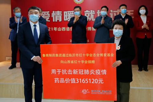 2021年2月4日,在“博爱情暖·就地过年”——山西省红十字会2021年红十字博爱送万家活动启动仪式上,鲁南制药集团股份有限公司和太原祺紫天禄殡葬有限公司两家爱心企业,向省红十字会捐赠了价值326万元的防疫药品和口罩等“抗疫”物资。省红十字会党组书记、常务副会长郑红代表省红十字会接受捐赠。据悉,该批捐赠物资将全部用于我省疫情防控一线机构“抗疫”工作。