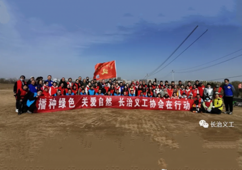 长治市义工协会协同高河能源志愿服务协会、长治市营养师协会、清华中学、长治学院志愿者团队、国家税务总局长治市郊区税务局第一党支部、长治医学院附属和济医院医辅一支部、长治市发展和改革委员会机关第三党支部为山清秀美之地——塔岭山再添新绿。