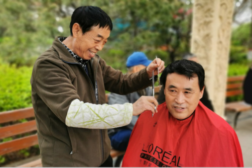 2021年4月10日,在太原市小店区滨东花园小区生活广场,共产党员郭建平为小区居民开展义务公益理发活动。