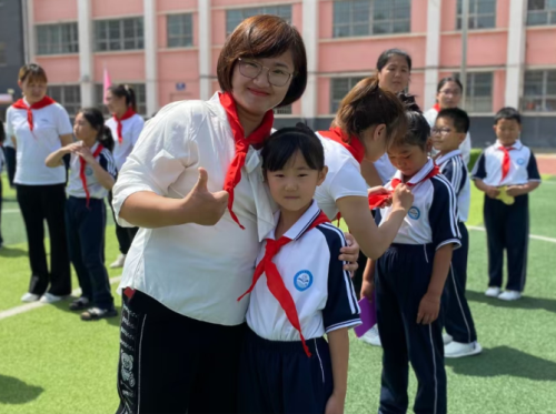 大队辅导员杜老师带领着全体少先队员呼号:准备着,为共产主义事业而奋斗!小少先队员们认真的神情在脸庞上浮现。