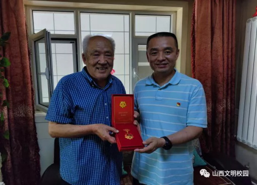 6月26日,太原市迎泽教育工委委员、教育局副局长杨辉,太原市滨河小学校党支部书记陈洁,党支部副书记、校长武立荣及青年教师来到老党员、老校长张天和家中走访慰问,颁发“光荣在党50年”纪念章,并向他致以崇高的敬意和诚挚的问候。