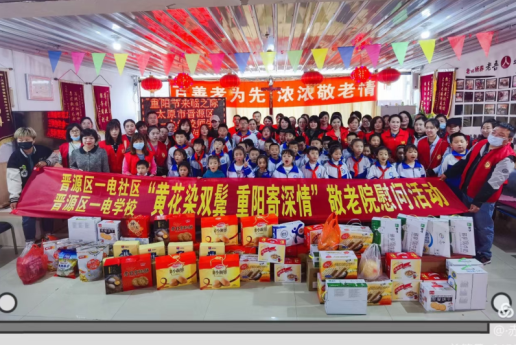 流水淡,碧云长。九月九,话桑麻。值此重阳佳节,晋源区一电学校携手一电社区组织家长、学生以及社区志愿者去晋源区雅松老年公寓进行“黄花染双鬓,重阳寄深情”慰问活动,为老人们带去了秋天丰收的食物,各色瓜果,各种营养品,各路小零食。可爱的孩子们还带来了自己精心准备的节目,让老人们在这个安静如常的午后感受着轻松和愉悦。