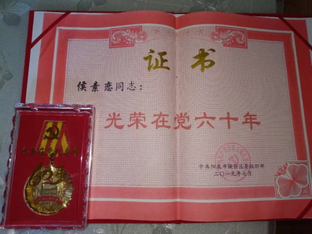 老人展示城区组织部颁发的纪念章和荣誉证书,满满的荣誉感