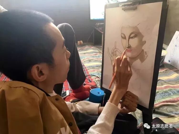 小旭飞在这样艰苦的环境下勤学勤练,每一幅画都倾注着他的心血,在场的每一个志愿者都被他持之以恒的精神深深感动。