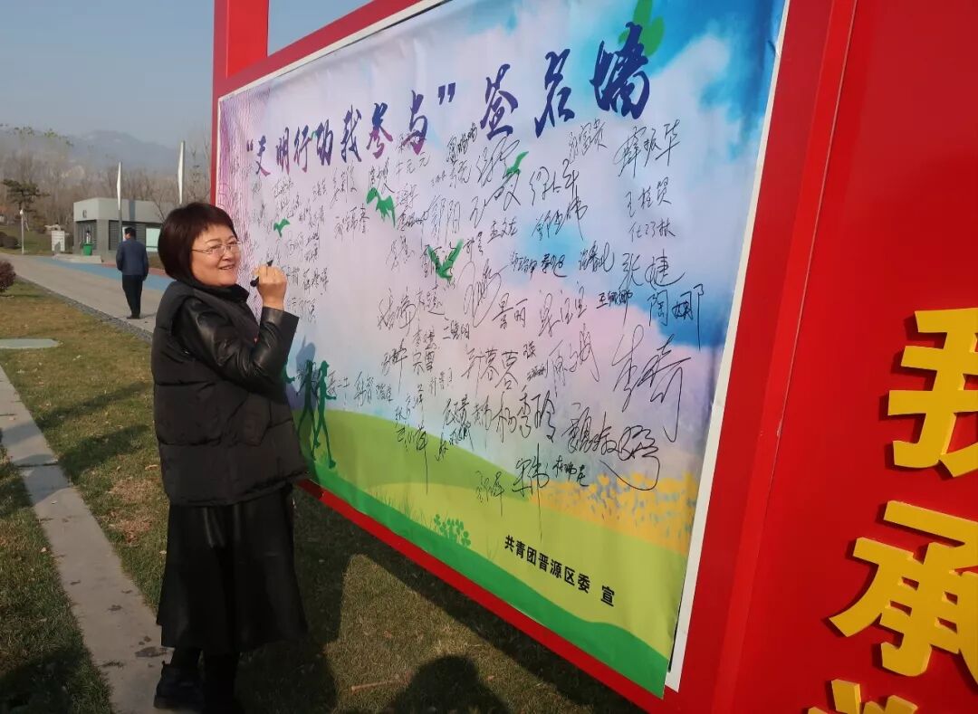 随后,部分团组织代表依次上台递交“1+X”创城承诺书(“1”为固定志愿服务活动项目,由各级团组织从“义务服务”“义务陪伴”“义捐义卖”“义务宣教”4项义务行动中选择其一开展;“X”为创意项目,由各团组织结合实际,自行拟定开展),并作“义务行动”一句话宣言,由工作人员将承诺书版面依序放置,最终呈现出“创文明太原城 做时代新青年”组合宣传布景。出席活动领导以及代表纷纷在文明创城宣传签名墙上签下了自己的名字,做出文明承诺。