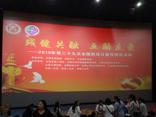 2019年5月18日上午,九达国际影城门口热闹非凡,人来人往,熙熙攘攘,志愿者们忙忙碌碌,小孩及家长赶着奔向影院,过路的人们纷纷问询,今天看电影的人为什么这么多,志愿者赶忙给大家解释,太原市龙城义工志愿者团队联合九达国际影城免费为残疾人士,残疾儿童放映电影。