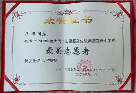 荣获2019-2020年度大同市最美公益志愿者——梁超 雷锋志愿服务队 10月30日