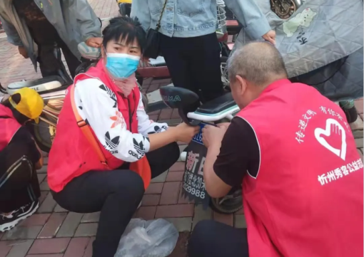忻州市秀容志愿者团队志愿者主动配合交警免费为市民安装电动车牌 岳佩成 9月20日